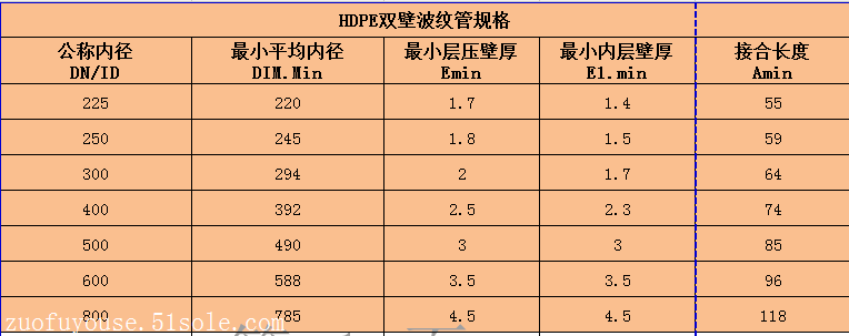 HDPE双壁波纹管是一种以高密度GB/T为原材料的轻质管,具重量轻,耐高压,柔韧好,施工快,寿命长的特性。其优良的管壁结构设计与其他结构的管相比之下大大减低了成本,并且由于其连接便捷确实的缘故,在国内外取得了普遍的应用,替代了大量的混凝土管和铸铁管。聚乙烯19472.1-2004“埋入式聚乙烯(PE)结构墙管道系统第1部分:聚乙烯双壁波纹管”的实施。弹性密封件满足HG/T 3091-2000的要求。
